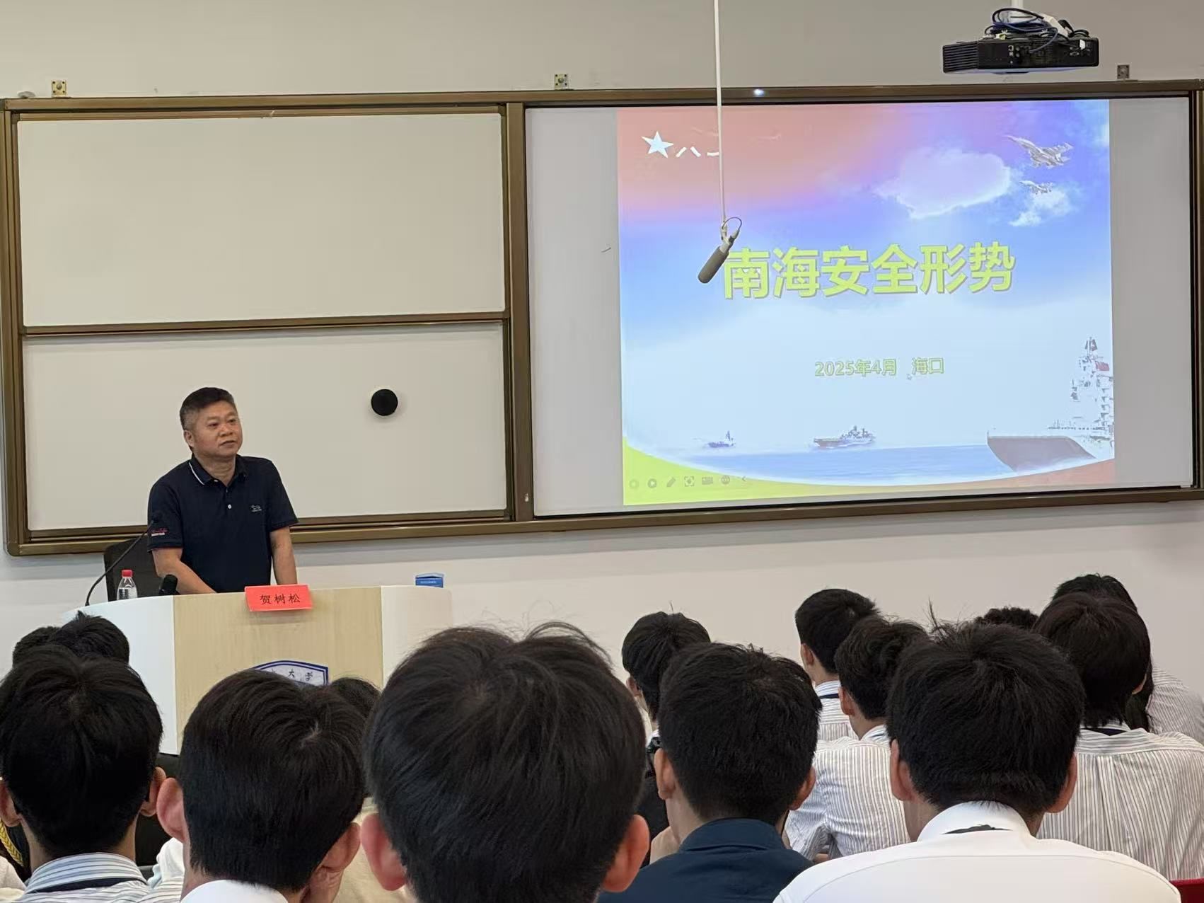 升旗仪式后,今朝书院国防辅导员、海口市机关事务管理局四级调研员贺树松以《南海安全形势》为题作主题讲座。他从南海的广阔疆域、历史沿革、地位价值和问题现状四个方面细致地讲述了南海的概况,指出了当今南海安全形势的复杂性和重要性。